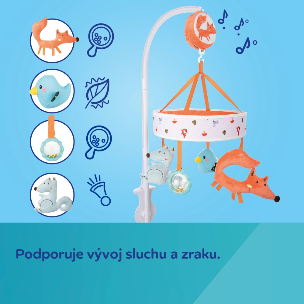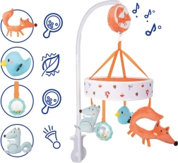 Kolorowa karuzela nad łóżeczko z uroczymi pluszowymi zwierzątkami z kolekcji FOX przyciąga uwagę maluszka i tworzy przyjemną rutynę usypiania. Ręcznie nakręcany mechanizm odtwarza spokojne melodie, które wyciszają dziecko i ułatwiają zasypianie – bez potrzeby baterii.