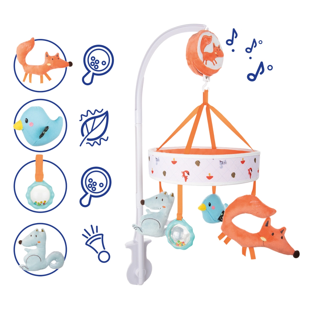 Bezpieczne i stabilne mocowanie do łóżeczka zapewnia wygodny montaż. Zawieszone zabawki oferują różnorodne bodźce (szelest, piszczenie, grzechot), które rozwijają stymulację wzrokową i słuchową oraz koordynację motoryczną już od 0m+.