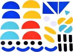 Różnorodne geometryczne elementy z przyjemnego w dotyku materiału wspierają trening motoryki małej, rozpoznawanie kolorów i kształtów oraz wyobraźnię przestrzenną.