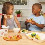 Dzieci wcielą się w dostawcę i klienta, zapakują menu do pudełek na jedzenie na wynos i podadzą wszystko na tacy, którą staje się samo opakowanie. Realistyczny wygląd produktów spożywczych oraz połączenie elementów plastikowych i filcowych sprawiają, że zestaw świetnie nadaje się do zabawy w gotowanie i wspólne uczty z przyjaciółmi.