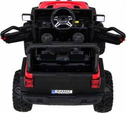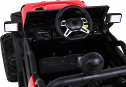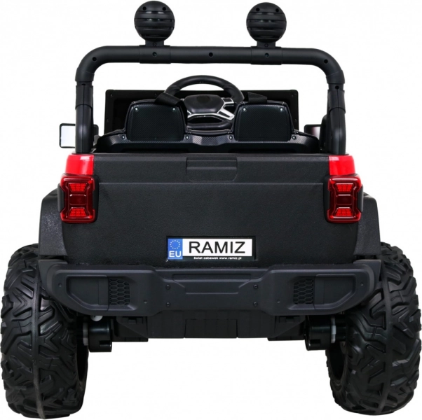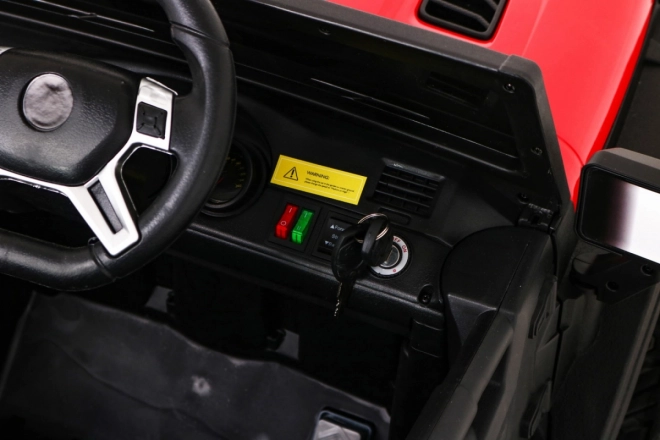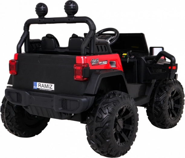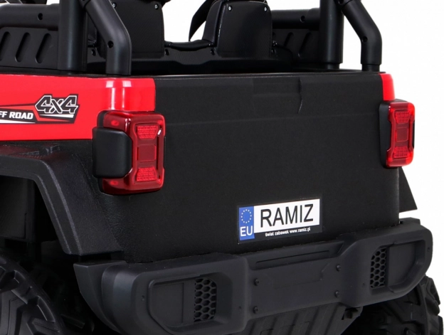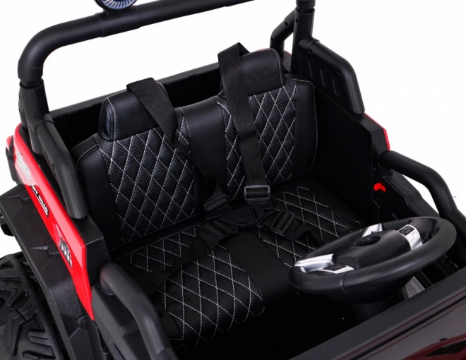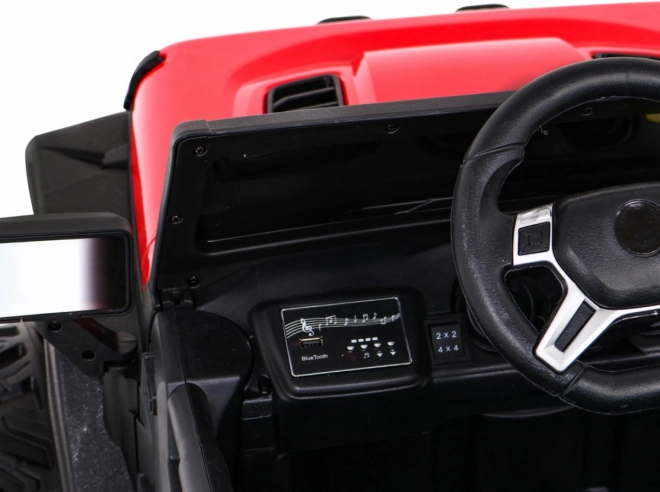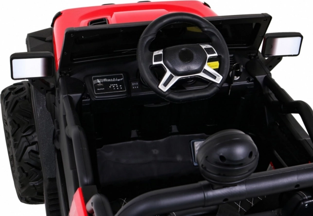 Wnętrze zachwyca wentylowanym siedziskiem z ekoskóry z pasami, rozruchem na kluczyk oraz multifunkcyjnym panelem audio z Bluetooth, USB, MP3 i gniazdem SD. Rodzice docenią pilot 2,4 GHz z trzema prędkościami i funkcją Stop. Praktyczny tylny bagażnik oferuje miejsce na zabawki i drobiazgi w podróży.