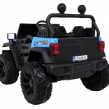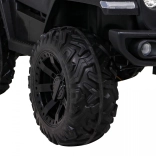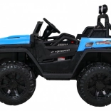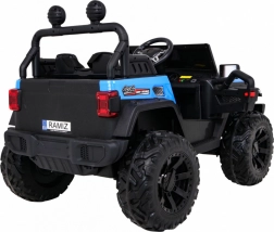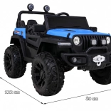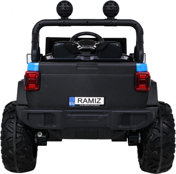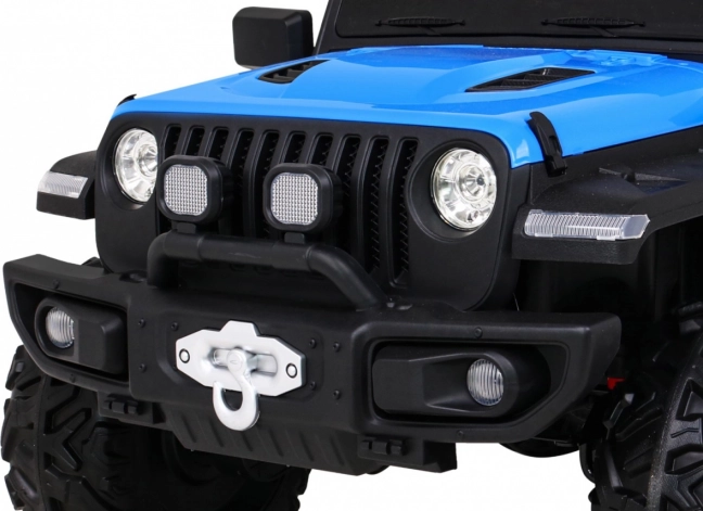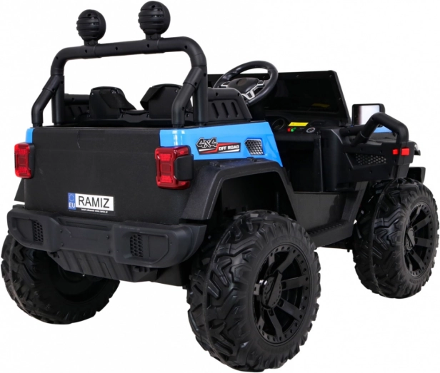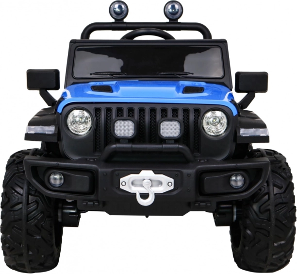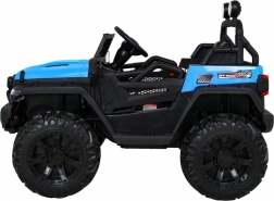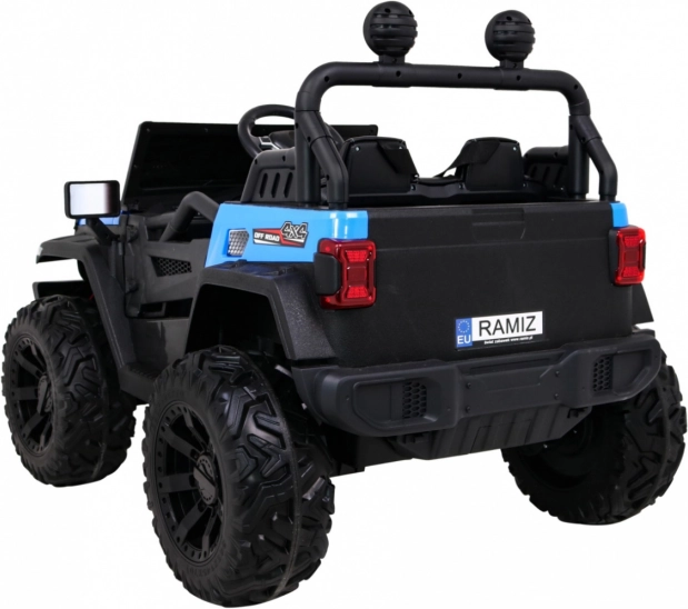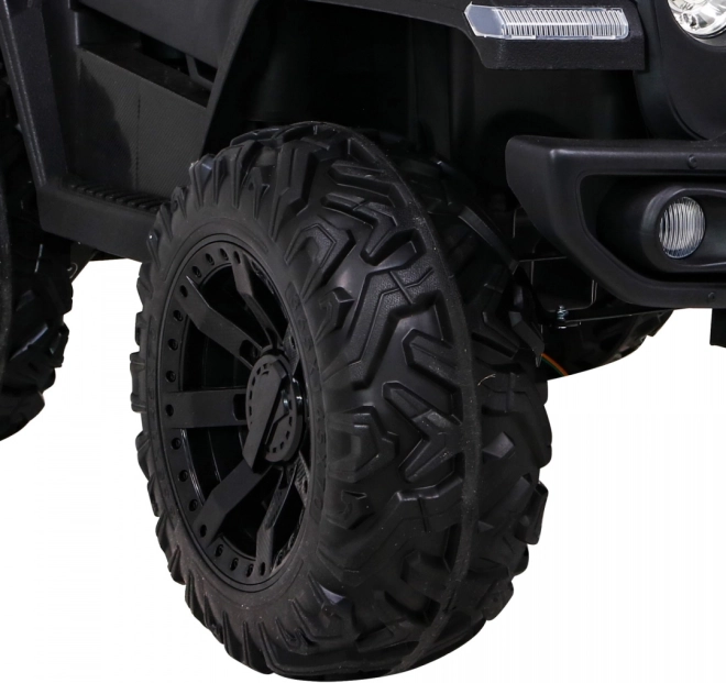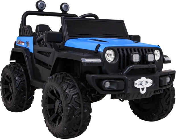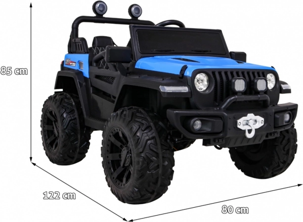 Solidny dziecięcy elektryczny samochodzik terenowy z napędem 2x4 / 4x4, czterema silnikami 4×35 W i akumulatorem 12 V / 10 Ah. Oferuje miękkie koła EVA, przednie i tylne światła LED, zdalne sterowanie 2,4 GHz z przyciskiem Stop oraz bogate audio: Bluetooth, MP3, USB, SD. Uruchamianie na kluczyk, otwierane drzwi z blokadą i wygodne siedzenie z eko skóry z pasami dla bezpiecznej i przyjemnej jazdy.