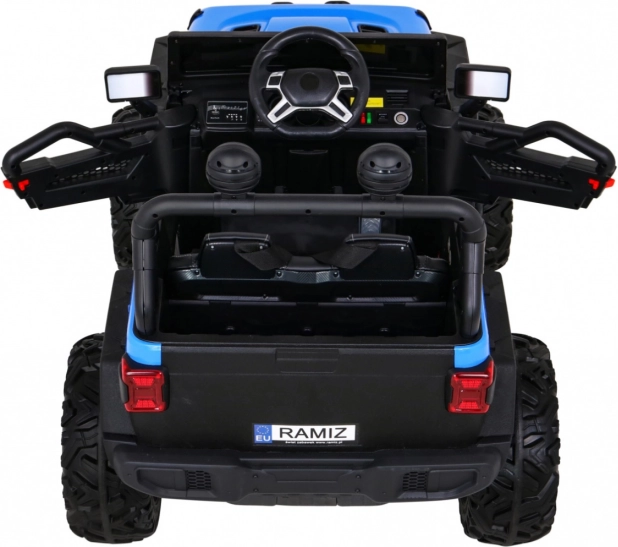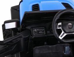 Młodzi kierowcy docenią rozruch na kluczyk, realistyczne oświetlenie LED i bogate możliwości audio – Bluetooth, MP3, USB, SD oraz dźwięki w kierownicy. Rodzice mają pełną kontrolę dzięki pilotowi 2,4 GHz z trzema prędkościami i przyciskiem Stop dla bezpieczeństwa. Otwierane drzwi z blokadą, siedzisko z wentylowanej eko skóry z pasami bezpieczeństwa oraz tylny schowek dopełniają praktyczne wyposażenie.
