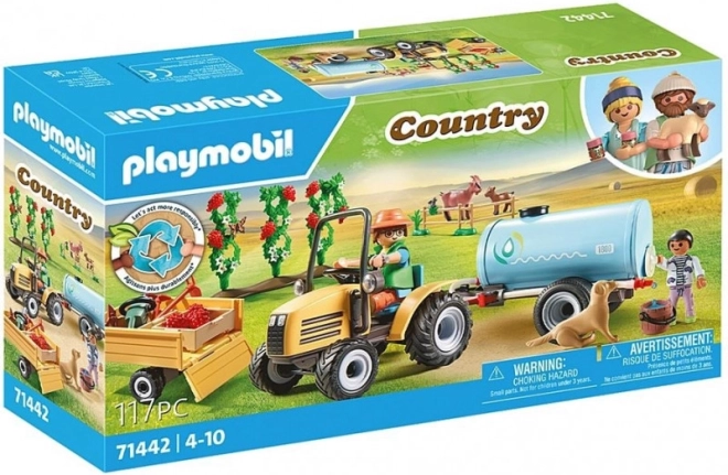 Traktor z przyczepą i cysterną na wodę umożliwia dzieciom bezpieczny transport towarów lub napełnianie cysterny wodą.