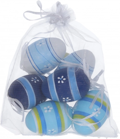 Ozdobne plastikowe jajeczka, które ozdobią Twój dom. Każde jajeczko ma 6 cm, a opakowanie zawiera 6 szt. w eleganckim woreczku organzowym.