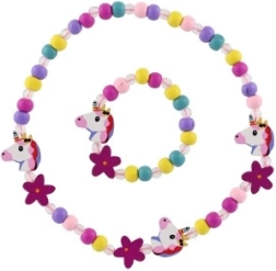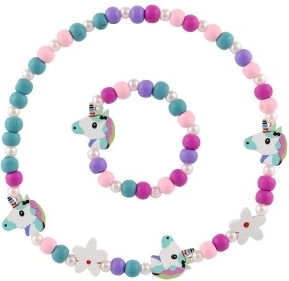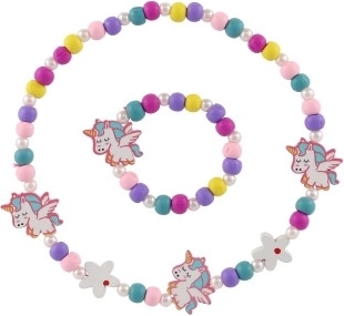 Ten pełen zabawy zestaw dziecięcej biżuterii – naszyjnik i bransoletka – zachwyca wesołymi kolorami, koralikami oraz zawieszkami z motywem jednorożców i kwiatów. Połączenie drewna i plastiku jest lekkie, przyjemne w dotyku i odpowiednie do codziennego noszenia.