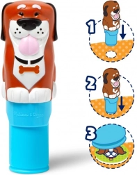 Zestaw zawiera sympatyczną pieczątkę w kształcie brązowego psa, wkładkę z 300 kolorowymi naklejkami o różnych tematach i 24-stronicową książeczkę z kolorowymi tłami, na które dzieci mogą nakładać naklejki i tworzyć własne historie.