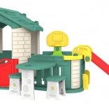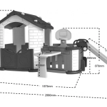 Domek oferuje wiele możliwości zabawy dzięki zintegrowanej zjeżdżalni, koszowi do koszykówki oraz ogródkowi z płotkiem.