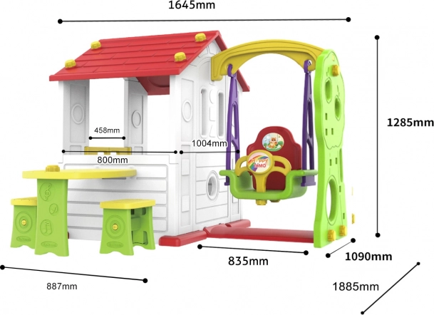 Plastikowy domek zapewnia dużą przestrzeń wewnętrzną do swobodnej zabawy, w tym duże otwierane drzwi oraz bezpieczną, dwuwarstwową huśtawkę. Konstrukcja jest również wyposażona w bezpieczny stolik i krzesełka. Możliwość demontażu ogródka i dodania kolejnej ścianki zwiększa zmienność i możliwość dopasowania domku.