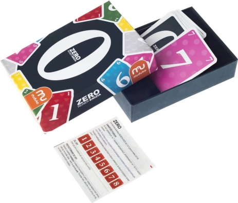 Zero to gra karciana łącząca taktykę, szczęście i spostrzegawczość. Cel jest prosty: zdobyć jak najmniej punktów i dążyć do idealnego wyniku – ZERO. Osiągnięcie tego nie jest jednak łatwe, ponieważ wymaga skompletowania zestawu kart w jednym kolorze oraz zestawu kart o tej samej wartości. Warto pilnować, aby na koniec ostatniej rundy nie zostało zbyt wiele kart, które nie pasują do żadnego zestawu. To świetna zabawa w każdych warunkach, a małe pudełko zmieści się nawet w kieszeni.