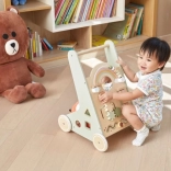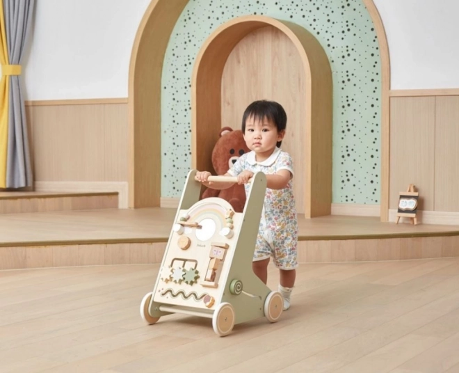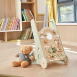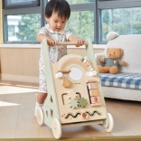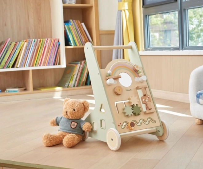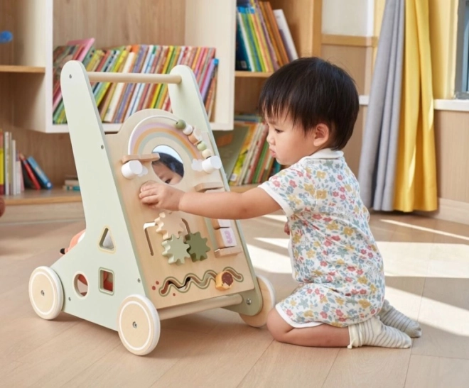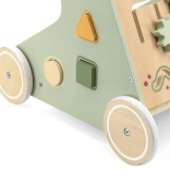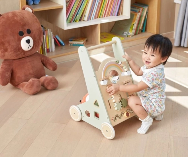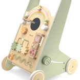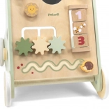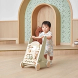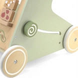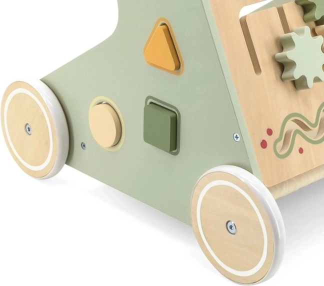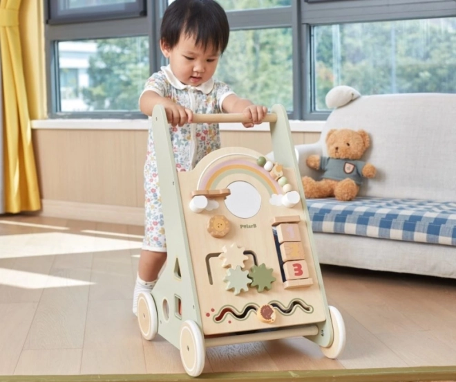 Drewniany pchacz chodzik PolarB Viga został zaprojektowany tak, by bezpiecznie towarzyszyć dzieciom w ich pierwszych krokach, a jednocześnie motywować do odkrywania. Przedni panel oferuje wiele aktywności – od obracających się kółek zębatych, przez przesuwne labirynty, aż po sorter kształtów i lusterko, które naturalnie rozwijają zmysły i myślenie logiczne.