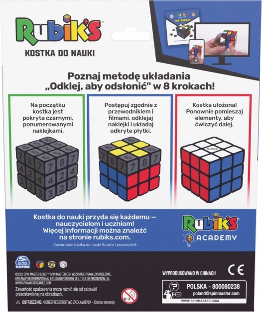 Zawsze chciałeś ułożyć Kostkę Rubika, ale nie wiesz, od czego zacząć? Rubik’s: Training Cube to uproszczony sposób nauki układania Kostki Rubika. Ucz się szybciej dzięki naklejkom. Metoda „peel to reveal” (odklej, aby odkryć) to najprostszy sposób, by opanować układanie kostki 3x3. Ośmiostopniowa metoda „peel to reveal” zapewnia wsparcie w rozwiązywaniu dzięki dołączonemu przewodnikowi krok po kroku i filmom. Na początku kostka jest oklejona ponumerowanymi czarnymi naklejkami. Zgodnie z przewodnikiem i filmami zdejmuj naklejki i rozwiązuj odkryte elementy. Zanim się obejrzysz, cała kostka będzie ułożona. Odklejaj losowe ścianki i powtarzaj ćwiczenie. Teraz masz zwykłą Kostkę Rubika 3x3, z którą możesz bawić się bez końca. Odklejanie naklejek i stopniowe rozwiązywanie odkrytej grupy elementów upraszcza naukę i ogranicza rozpraszanie. Przewodnik i wideolekcje zostały zaprojektowane tak, by się uzupełniały i zapewniały najwyższy poziom nauki. Rubik’s: Kostka treningowa to odpowiednie narzędzie dla każdego, w tym nauczycieli, uczniów, hobbystów i wszystkich od 8. roku życia. Odwiedź stronę coach.rubiks.com, aby znaleźć wskazówki dotyczące rozwiązywania Kostki Rubika. Spin Master oferuje domową rozrywkę z szeroką gamą zabawek i gier dla dzieci, w tym zabawek dla maluchów, zabawek dla dziewczynek i gier planszowych. Zbieraj ulubione pluszaki, zabawki antystresowe (fidget), samochody RC, figurki, lalki, akcesoria i wiele więcej. Od niebanalnych prezentów dla mężczyzn po zabawki dla niemowląt, dzieci i tych, którzy w sercu czują się dziećmi – nasz obszerny katalog ułatwi wybór prezentów urodzinowych. Jeśli masz ochotę na więcej, odkryj gry dla dzieci, zabawki do basenu, gry plenerowe i monster trucki na każdą porę roku. Rozwijaj kreatywność z artykułami plastycznymi, zabawkami konstrukcyjnymi i autkami zdalnie sterowanymi, a także przenieś akcję na stół dzięki łamigłówkom dla dorosłych lub grom karcianym. Już dziś wskocz do piaskownicy ze Spin Master.