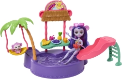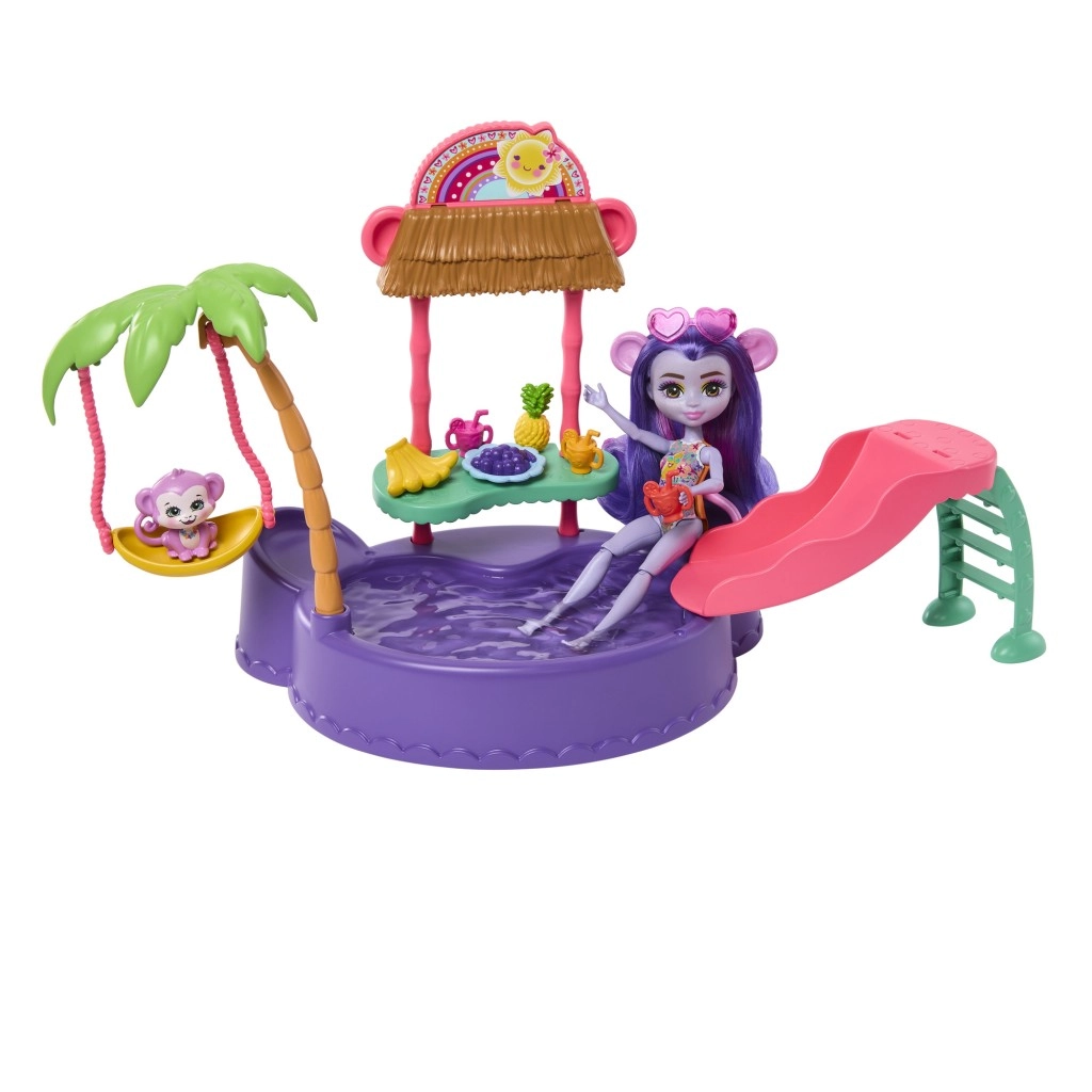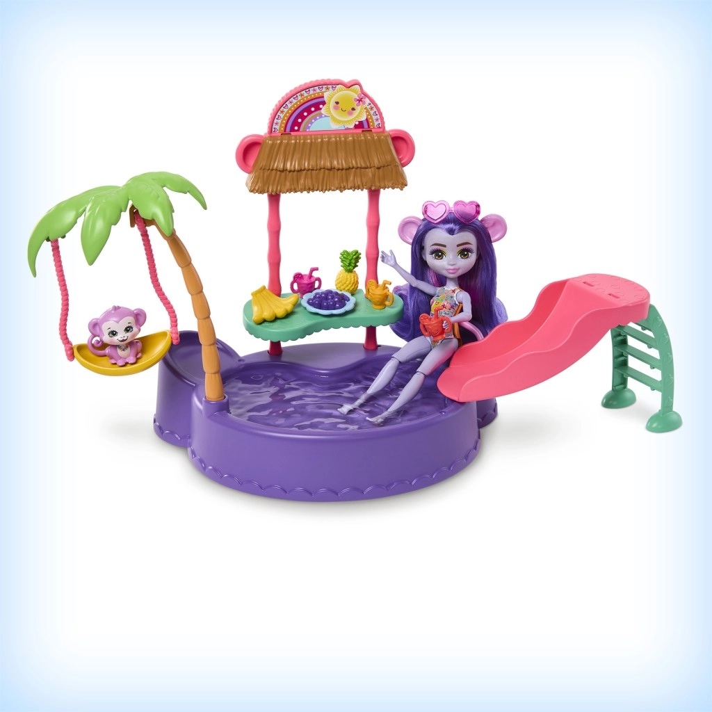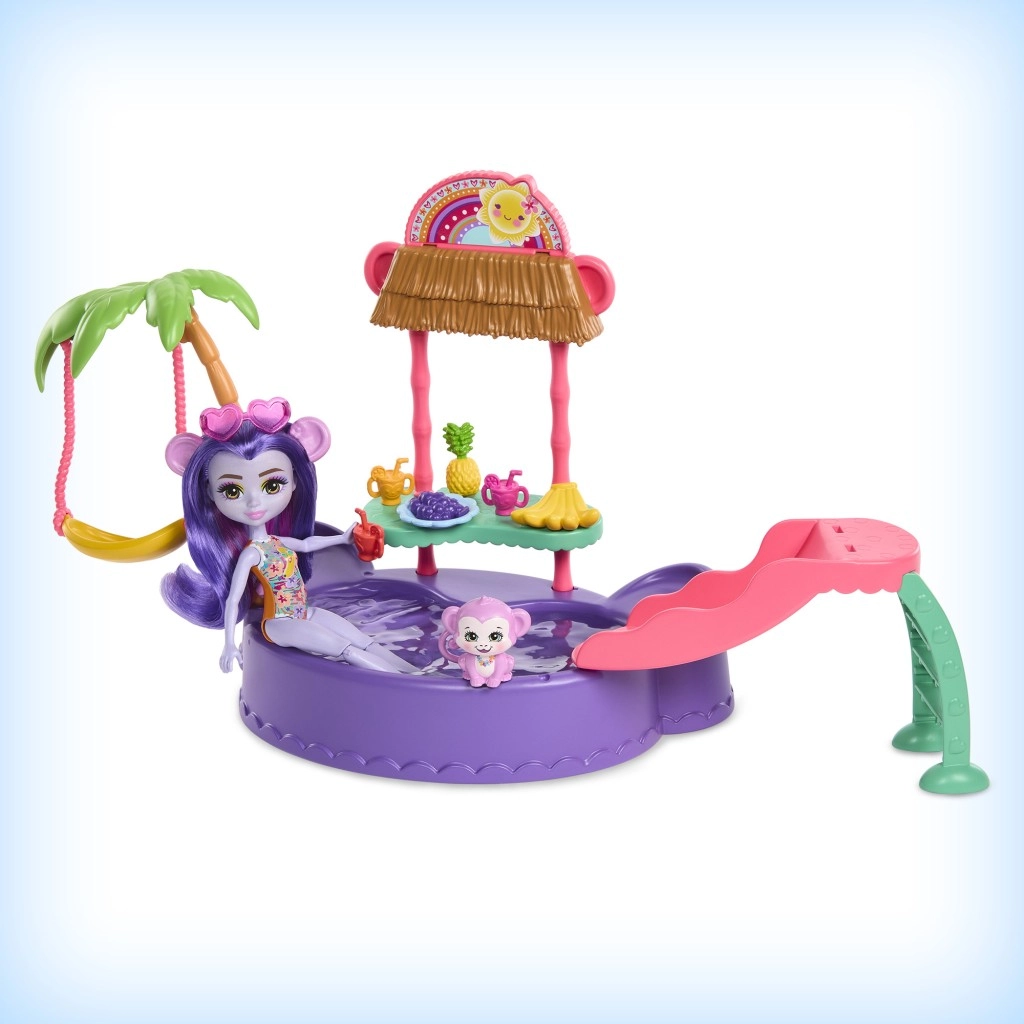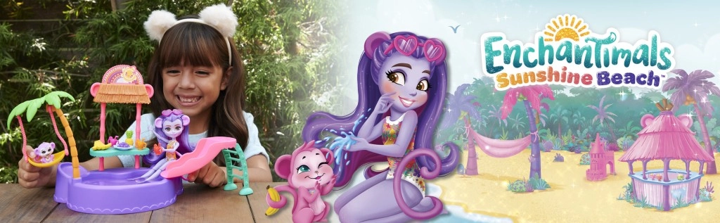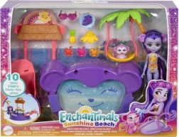 Ten kolorowy zestaw do zabawy ENCHANTIMALS przenosi klimat plaży prosto do dziecięcego pokoju. Lalka w wbudowanym stroju kąpielowym i z okularami przeciwsłonecznymi w kształcie serduszek jest gotowa na dzień pełen słońca, kąpieli i przysmaków ze stoiska. Małpka może bujać się na palmie lub zjeżdżać prosto do baseniku.