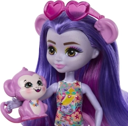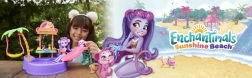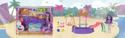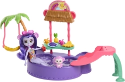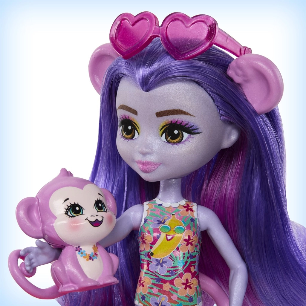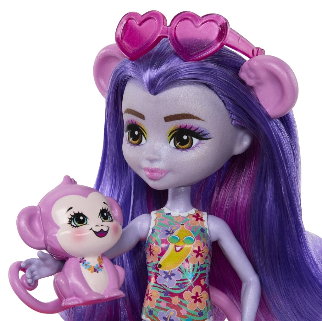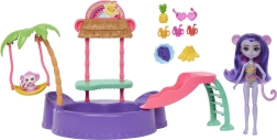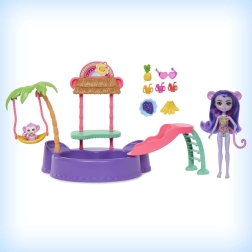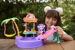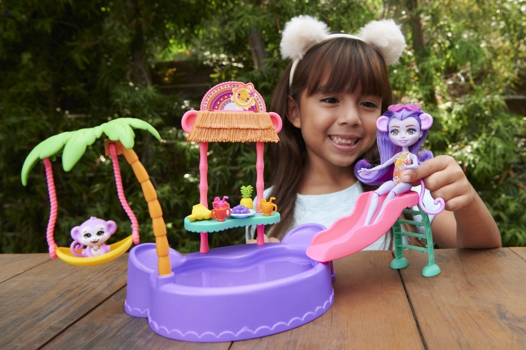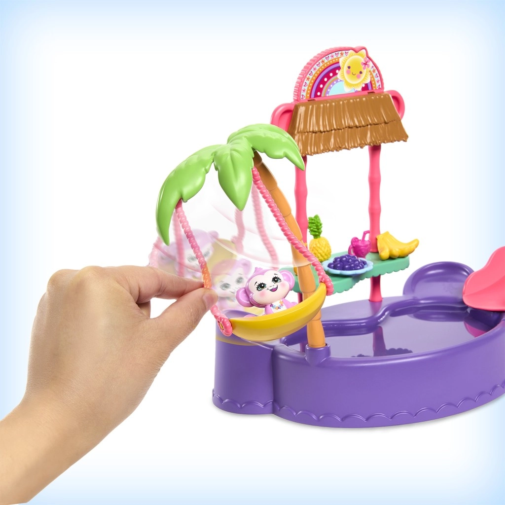 Ten kolorowy zestaw do zabawy ENCHANTIMALS przenosi klimat plaży prosto do dziecięcego pokoju. Lalka w wbudowanym stroju kąpielowym i z okularami przeciwsłonecznymi w kształcie serduszek jest gotowa na dzień pełen słońca, kąpieli i przysmaków ze stoiska. Małpka może bujać się na palmie lub zjeżdżać prosto do baseniku.