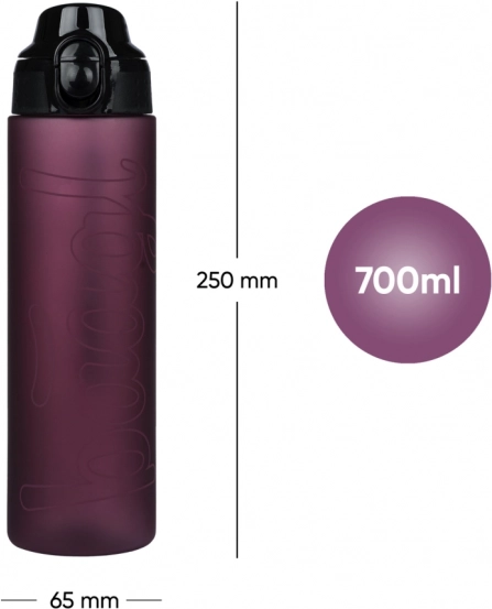 Pojemność 700 ml w kompaktowym korpusie (ok. 250 × 65 mm) mieści się w plecaku i w uchwycie na bidon. Idealna do szkoły i na sport.