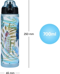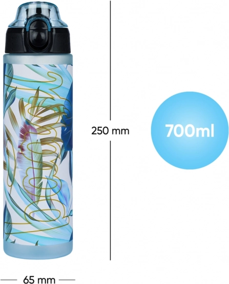 Stylowa i bezpieczna dla zdrowia butelka na wodę z certyfikowanego tritanu do codziennego nawadniania. Ma pojemność 700 ml, zatrzaskową, szczelną pokrywkę z szybkim otwieraniem oraz pętelkę do wygodnego noszenia. Materiał jest bez BPA, PVC i ftalanów, nie pochłania zapachów i idealnie sprawdzi się w szkole, w pracy, na sport i wycieczki.