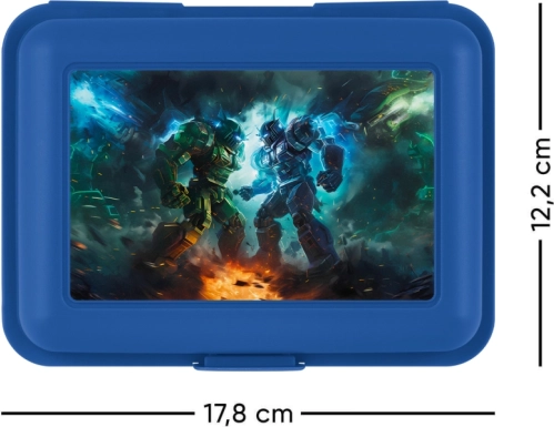Przedstawiamy innowacyjne pudełko na drugie śniadanie dla wszystkich miłośników sci‑fi i robotów. To niebieskie plastikowe pudełko śniadaniowe łączy styl z praktycznością. Wyposażone w bezpieczne zamknięcie na jeden zatrzask, gwarantuje, że Twoje jedzenie pozostanie bezpiecznie w środku. Dzięki przegrodom łatwo oddzielisz różne rodzaje potraw, co sprzyja czystemu i uporządkowanemu posiłkowi.