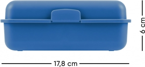 Niebieskie plastikowe pudełko ma wymiary 17,8 cm x 12,2 cm, dzięki czemu jest idealne do wygodnego przenoszenia i przechowywania posiłków.
