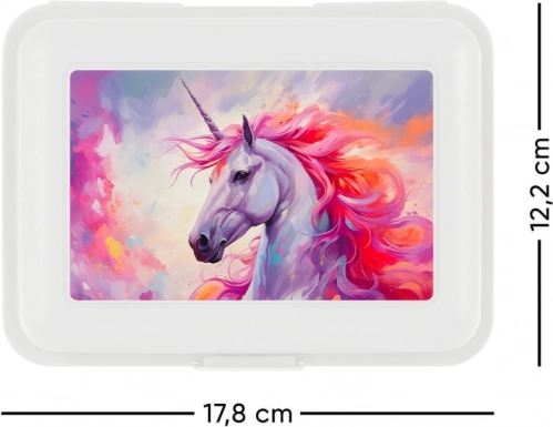 Plastikowe pudełko ozdobione kolorowym motywem jednorożca w żywych odcieniach różu i fioletu, który przyciąga uwagę i zachwyca szczególnie dzieci.