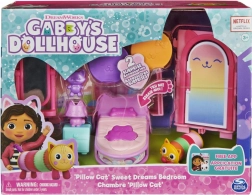 Stwórz w domu magiczny, wieczorny klimat z zestawem z animowanego serialu Gabby’s Dollhouse. Sypialnia „Sweet Dreams” zawiera figurkę Pillow Cat, zmieniające się łóżeczko–plac zabaw, ruchome lustro, stylową szafkę nocną z kocią lampką oraz Kocią Paczkę z niespodziankami – otwieraną książką i maską do spania, którą figurka naprawdę może nosić.