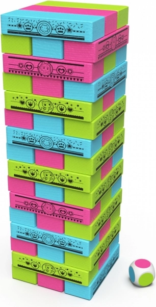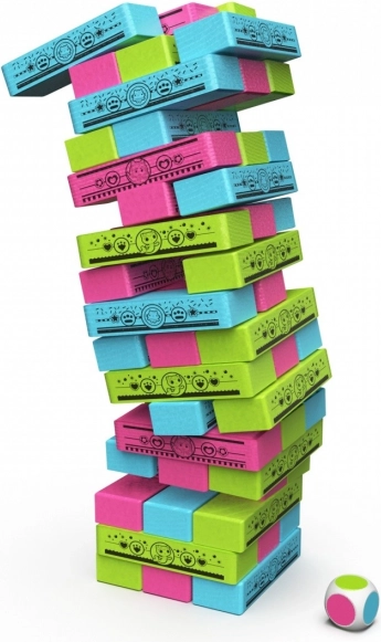 Gra jest uzupełniona kolorową kostką, która wskazuje, jaki kolor klocka wybrać, co zwiększa nagłe momenty zaskoczenia i zabawy.