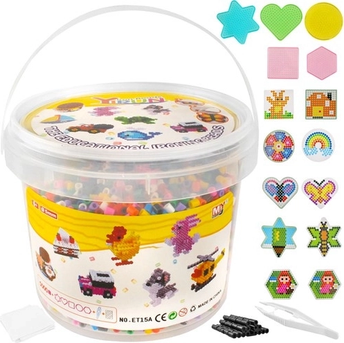 Kreatywny zestaw koralików do zaprasowywania, łącznie 5000 szt. w 10 kolorach, zapewnia godziny tworzenia i zabawy. Dzięki różnym formom (gwiazda, serce, koło, kwadrat, sześciokąt), podkładkom i dołączonej pęsecie dzieci łatwo wykonają płaskie oraz figury 3D. Lekki i przenośny wiadereczko z pokrywką pomaga utrzymać porządek. Zabawa wspiera motorykę małą, kreatywność i koncentrację.