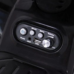 Stylowy dziecięcy quad na baterię z silnikiem 25 W, zasilaniem 6 V/4,5 Ah oraz przednimi światłami LED oferuje zabawną i bezpieczną jazdę. Dzięki panelowi audio z USB/AUX i wbudowanym melodiom dzieci w pełni wykorzystają każdą przejażdżkę.