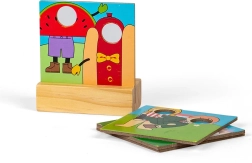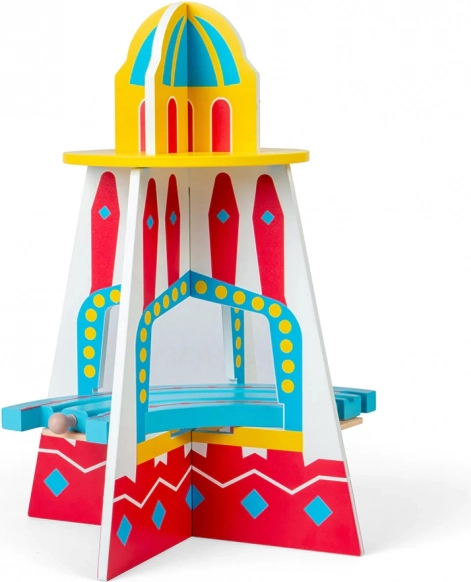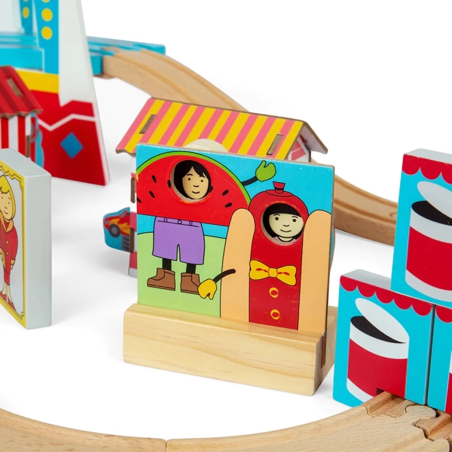 Ta drewniana kolejka z motywem wesołego miasteczka zawiera wszystko, czego potrzeba, aby zanurzyć się w świecie pełnym zabawy i radości. Dzieci mogą przejechać pociągiem obok cyrkowego namiotu, łowić kaczuszki lub robić zdjęcia z zabawnymi fototłami. Zestaw obejmuje: