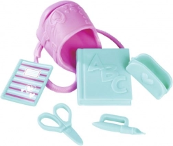 Zawiera przybory szkolne takie jak zeszyt, nożyczki, piórnik, długopis i podręcznik do realistycznej zabawy.