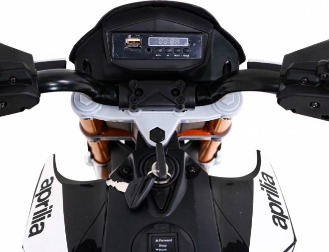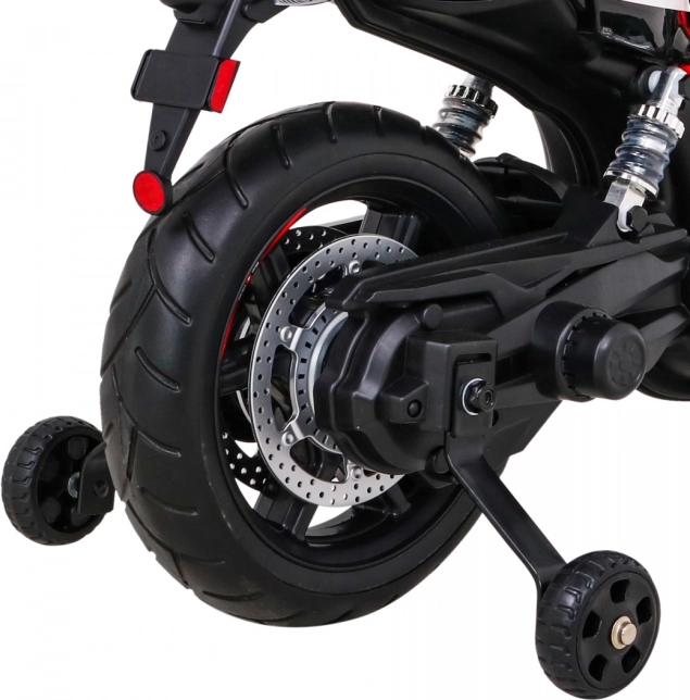 Stylowy dziecięcy motocykl elektryczny APRIAILA w czarnym wydaniu oferuje 2 wydajne silniki 12 V, miękkie koła EVA dla cichej jazdy, łagodny start oraz dwa biegi do przodu i do tyłu. Komfort zapewnia tylne zawieszenie, siedzenie z czarnej eko-skóry, a bezpieczeństwo wspierają boczne kółka pomocnicze. O zabawę dbają światła z przodu i z tyłu oraz panel audio z MP3/SD/AUX/USB. Uruchamianie odbywa się elegancko na kluczyk, a do dyspozycji jest wskaźnik naładowania.
