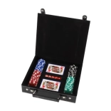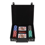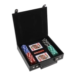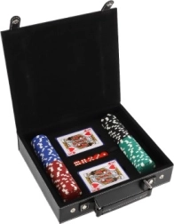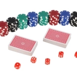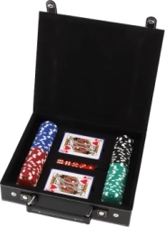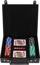 W zestawie znajdziesz wszystko, czego potrzebujesz do natychmiastowej gry: 100 szt. żetonów w podstawowych kolorach, 2 talie kart dla płynnej gry oraz 5 klasycznych kości do innych popularnych gier stołowych. Dzięki kompaktowym wymiarom zestaw jest łatwy do przenoszenia i idealny w podróży.