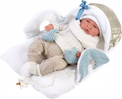 Praktyczna mata pozwala wygodnie ułożyć lalkę i bezpiecznie ją przenosić. Kaptur i miękkie materiały zapewniają przytulność w domu i w podróży.