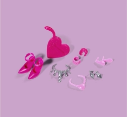 - Bogate akcesoria: 2 naszyjniki, 2 pary kolczyków, 2 bransoletki, torebka w kształcie serca, buty na obcasie.