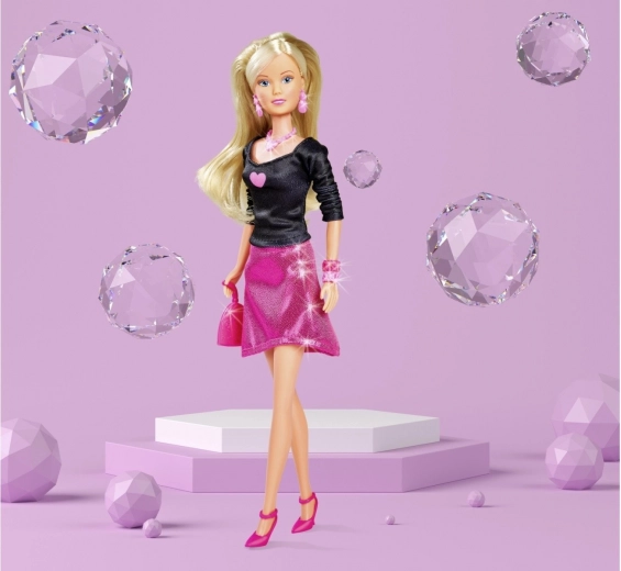 Lalka STEFFI LOVE – Jewelry Shop wprowadza dzieci w świat fantazji, mody i blasku. Steffi zachwyca połyskującym dwuczęściowym strojem z nadrukiem serca na wieczorowym topie oraz dopasowaną różową spódnicą. Bogaty zestaw biżuterii i dodatków pobudza kreatywną stylizację i rozwój dziecięcej wyobraźni.