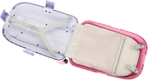 Wnętrze podzielone jest na dwie duże komory z elastycznymi paskami i kieszenią z siatki, co ułatwia przejrzystą organizację ubrań i drobiazgów. Wysuwany uchwyt oraz nóżka stabilizująca ułatwiają manewrowanie i zapobiegają przewracaniu się walizki.