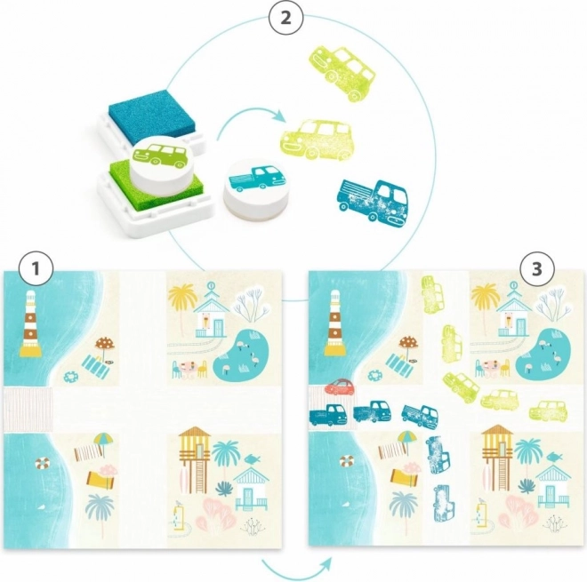 Zestaw stempelków z motywem samochodów, który pozwala dzieciom tworzyć urocze obrazki i rozwijać ich kreatywność.