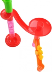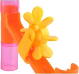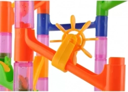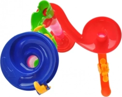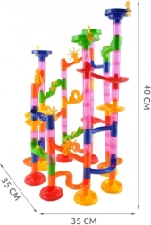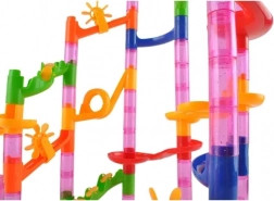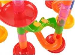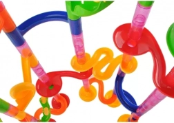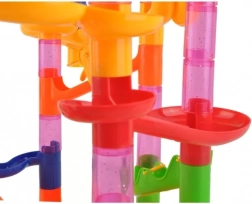 Ten kolorowy tor kulkowy pozwala dzieciom budować zróżnicowane trasy o różnym poziomie trudności. W zestawie znajdują się wiatraczki, pętle i zapory, które kulki aktywują w trakcie przejazdu. Elementy łączą się łatwo i intuicyjnie, dzięki czemu można szybko zmieniać konfiguracje i testować nowe pomysły.
