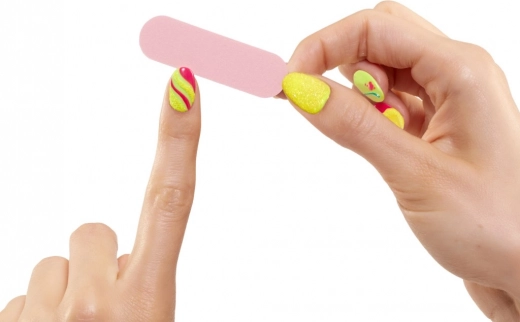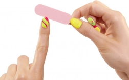 Pilnik, 2 zestawy samoprzylepnych i wielokrotnie zdejmowalnych paznokci, brokat oraz 2 buteleczki „laku” wspierają wyobraźnię i motorykę małą.
