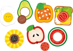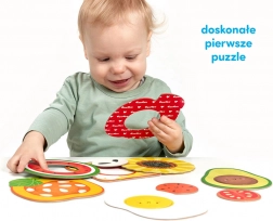 Zabawa puzzlami naturalnie rozwija małą motorykę, spostrzegawczość i cierpliwość. Wspólnie możecie nazywać produkty, kolory i kształty, szukać podobieństw i różnic oraz wymyślać pytania w stylu „Co ma pestki?” albo „Gdzie jest jajko?”. Starsze dzieci wykorzystają elementy także w zabawie w sklep czy gotowanie lub jako inspirację do własnych rysunków.