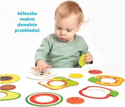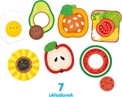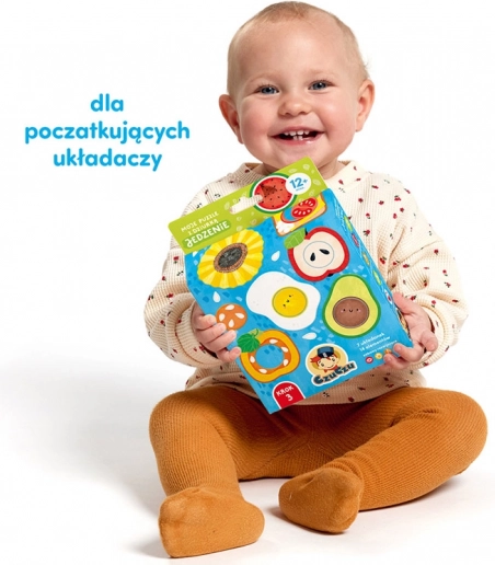 Pierwsze puzzle dla najmłodszych, które pachną zabawą! Zestaw zawiera 7 dużych, dwuelementowych układanek na temat jedzenia z wymiennymi kółeczkami. Dzięki prostemu systemowi wkładania układanie jest intuicyjne i motywujące. Wspiera małą motorykę, ciągłą koncentrację, percepcję kształtów i kolorów oraz naturalną radość odkrywania.