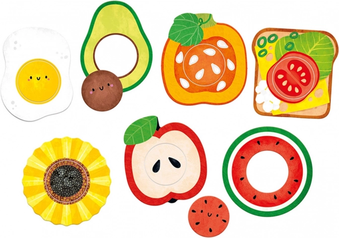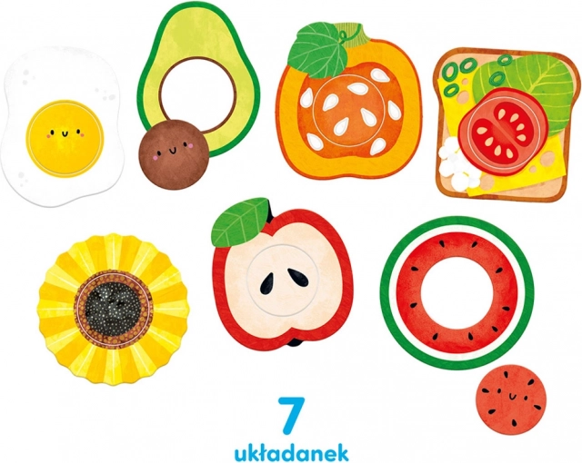 - 7 dużych dwuelementowych układanek na temat jedzenia