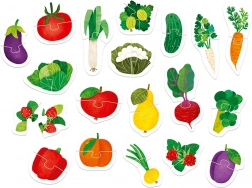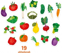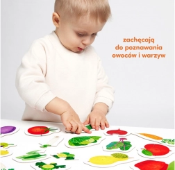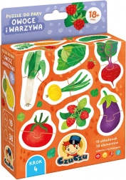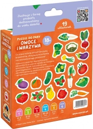 Na kolorowych puzzlach przedstawiono zdrowe pyszności z ogrodu i sadu. Szukanie i łączenie połówek to wszechstronna, rozwojowa zabawa, która poprawia koordynację ręka–oko i w przyjemny sposób pomaga uczyć się oraz utrwalać nowe słowa i wiedzę o świecie wokół nas.