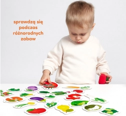 Wykorzystajcie grę do nauki nowych słów. Nazwijcie owoce i warzywa na ilustracjach, ich kolory oraz poszczególne elementy. Zwróć uwagę dziecka na podobieństwa i różnice między obrazkami.