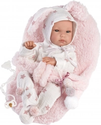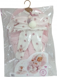 Urocze dwuczęściowe ubranko dla lalki-niemowlaka New Born o wielkości 35–36 cm zapewnia wygodę i styl w każdej zabawie. Zestaw obejmuje bluzkę z długim rękawem i spodnie we wzór gwiazdek i króliczka, uzupełnione o miękką podkładkę z trzypunktowym mocowaniem do bezpiecznego przenoszenia lub odpoczynku lalki. Ręcznie wykonane w Hiszpanii z przyjemnych materiałów, idealne do kreatywnej i opiekuńczej zabawy dla dzieci od 3 lat.