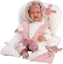Ten elegancki zestaw rozszerza możliwości zabawy z lalkami NEW BORN o wielkości 40–42 cm. Ubranko z delikatnymi zdobieniami i praktyczna podkładka z kokardą oraz paskami umożliwiają wygodne posadzenie lalki jak na krzesełku, co daje dzieciom więcej frajdy i realizmu podczas zabawy.