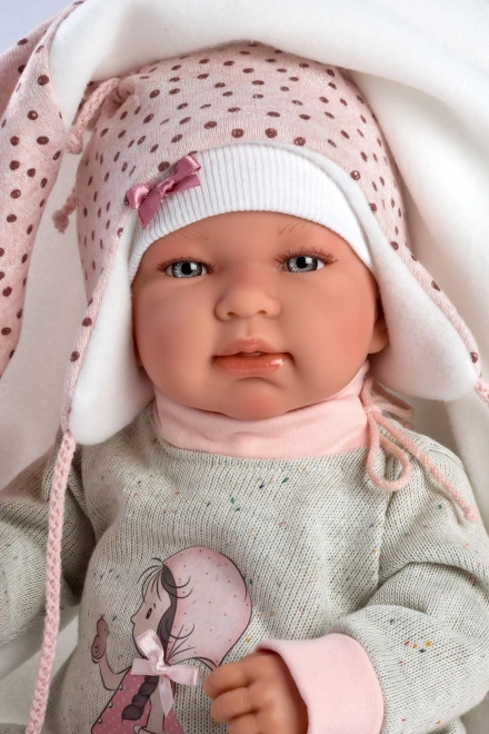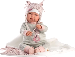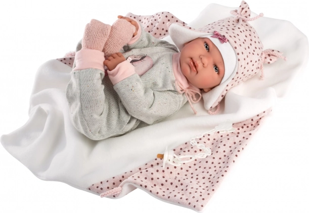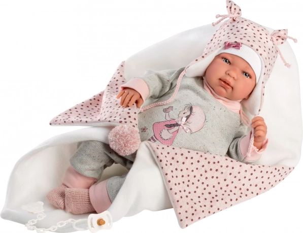 W zestawie znajduje się stylowy kocyk z pomponem do wiązania, który dopełni wygląd lalki i umili zabawę w usypianie.