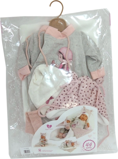 Podaruj swojej lalce nowy szykowny outfit, który pobudzi wyobraźnię i radość z zabawy. Ten 4‑częściowy zestaw dla lalek NEW BORN (43–44 cm) łączy wygodę i styl – dopasowane spodnie i top uzupełnia mięciutki kocyk z pomponem do wiązania oraz inne urocze akcesoria. Ręczna produkcja w Hiszpanii gwarantuje precyzyjne detale i przyjemne w dotyku materiały odpowiednie do dziecięcej zabawy.
