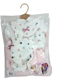 Praktyczny zestaw zawiera wszystko, co potrzebne do stylowego ubierania lalki‑niemowlaka o rozmiarze 38 cm. Świetna baza dziecięcej garderoby dla lalek.
