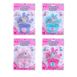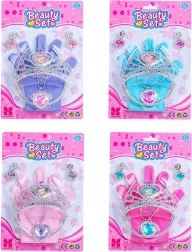 Zaczarowany zestaw akcesoriów dla małych księżniczek zawiera wszystko, co potrzebne do strojenia się: rękawiczki, koronę (12,5 cm), opaskę, naszyjnik i kolczyki. Dostępne są 4 warianty kolorystyczne – niebieski, fioletowy, różowy i czerwony.