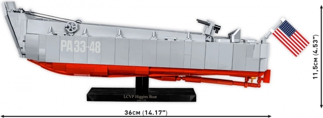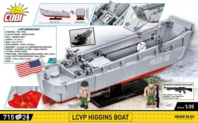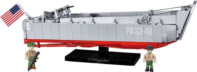 Łódź ma około 36 cm długości i oferuje bogate wyposażenie: otwieraną przednią rampę z mechanizmem linkowym, dwa karabiny maszynowe z osłonami, detaliczny ster, napęd i osłonę przedziału silnikowego. Dwie figurki – amerykański piechur i marynarz – uzupełnia dwustronnie drukowana flaga USA oraz elegancki stojak z nazwą „LCVP Higgins Boat”.